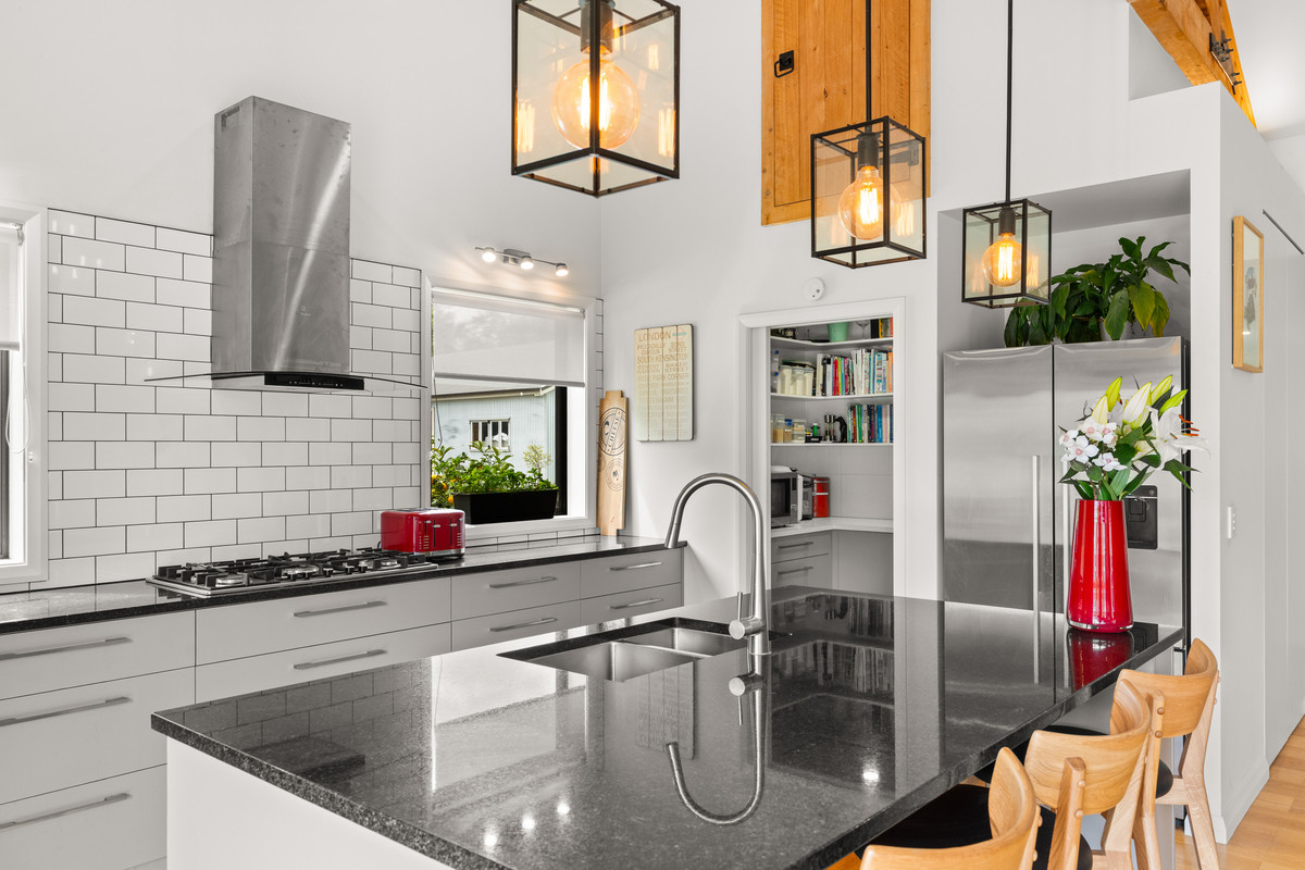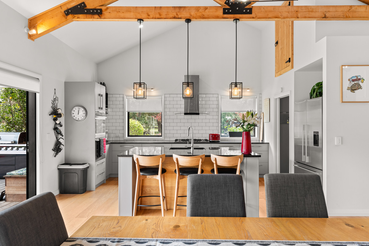 With spectacular exposed-beam cathedral ceilings, light-filled open living, and seamless indoor–outdoor flow, this home is designed for relaxed family living and effortless entertaining. The stylish kitchen, complete with butler’s pantry, anchors the social hub — a space made for cooking, conversation, and connection.